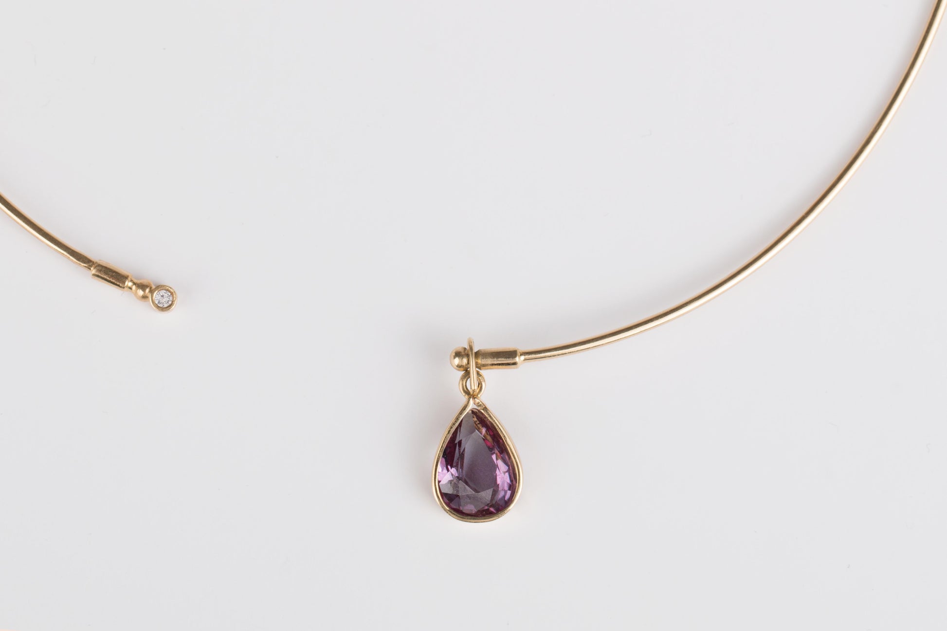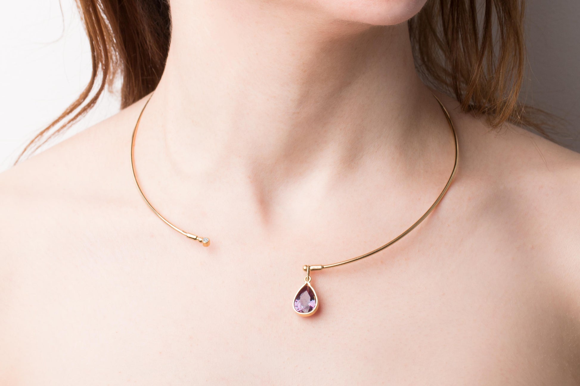 Design: Sleek, modern choker silhouette with a regal gemstone focus