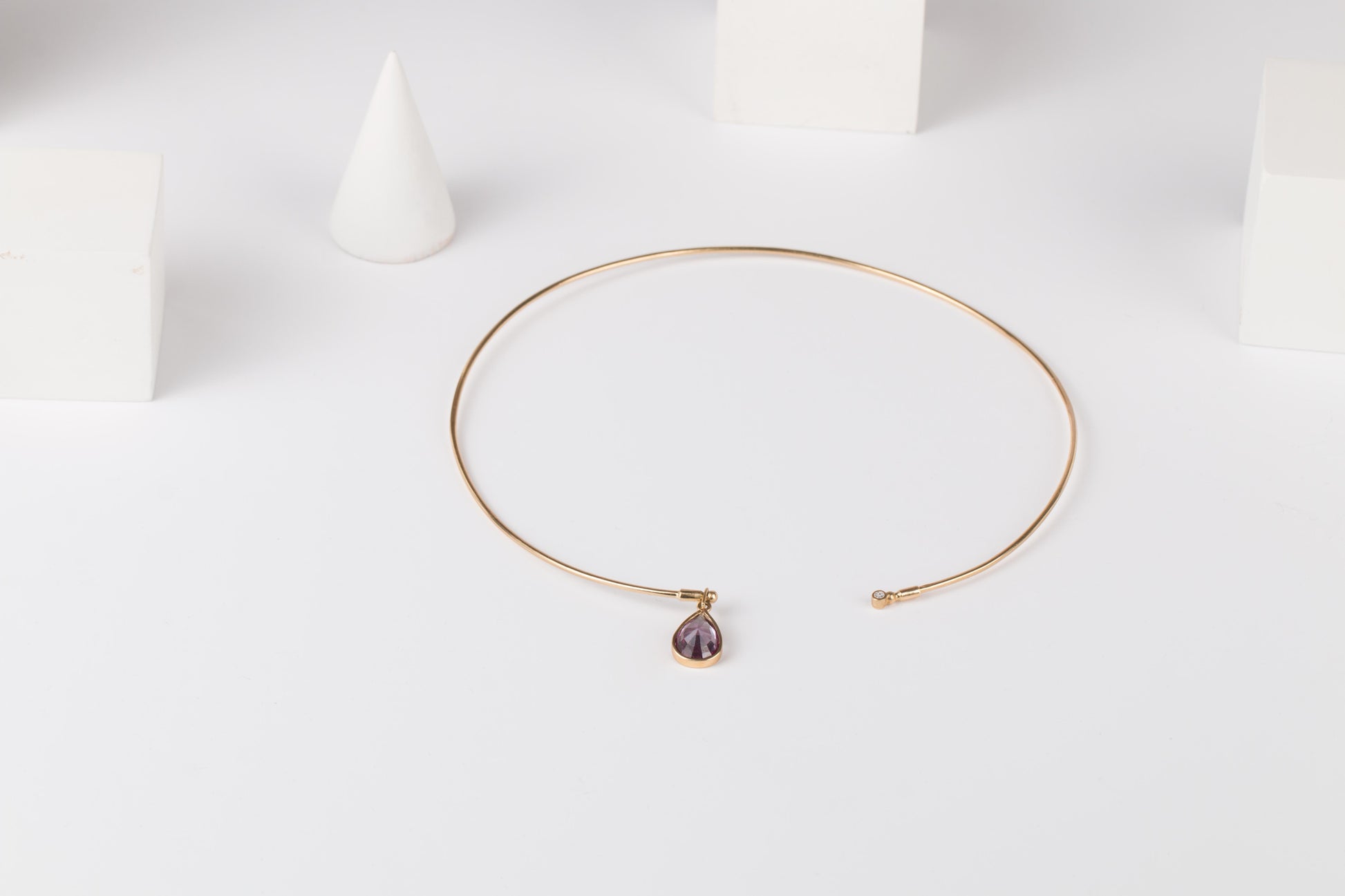 The 18K Amethyst Elegance Choker is a statement of quiet luxury and feminine power. Crafted in solid 18-karat gold, this timeless piece features a stunning, natural amethyst centerpiece—carefully cut to reveal its deep violet brilliance and known for its calming, intuitive energy.